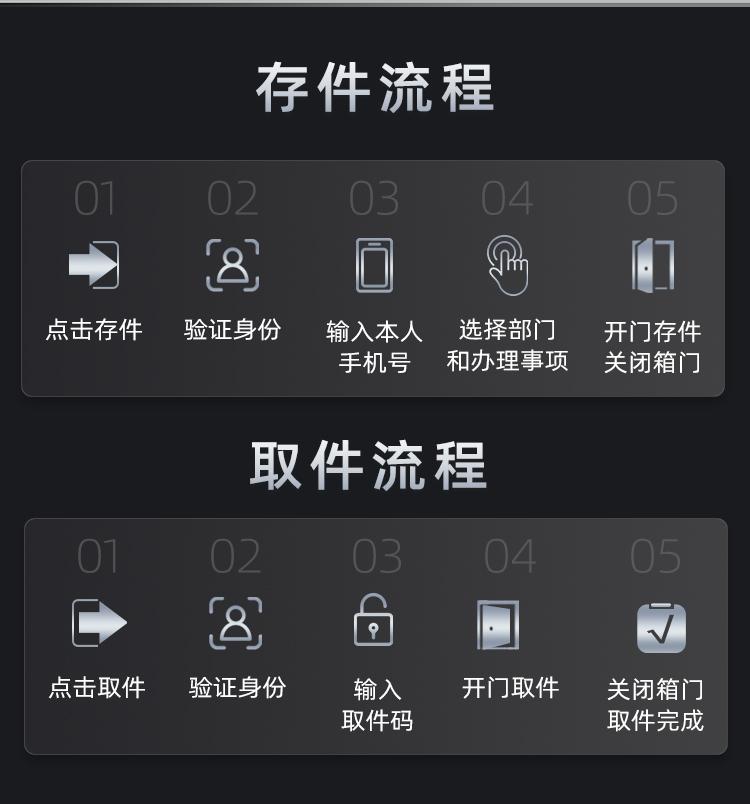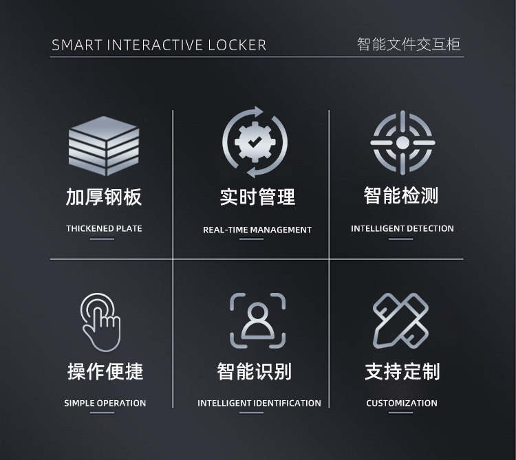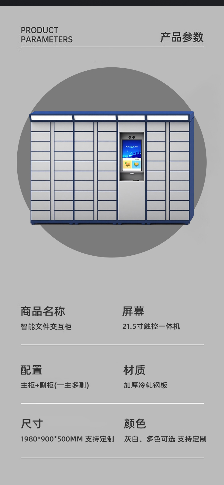 智能文件交換柜,又稱智能文件中轉柜,智能文件交接柜,電子文件交換箱,智能云柜等,是一款具有聯網、收發件、短信驗證碼通知功能的智能柜,主要表現為:工作人員將當事人需要的文件放入智能文件交換柜中,并通過系統下發短信驗證碼給當事人,當事人只需要前往機關辦事大廳,在智能文件交換柜終端顯示屏中輸入已有的驗證碼并取出自己需要的文件。