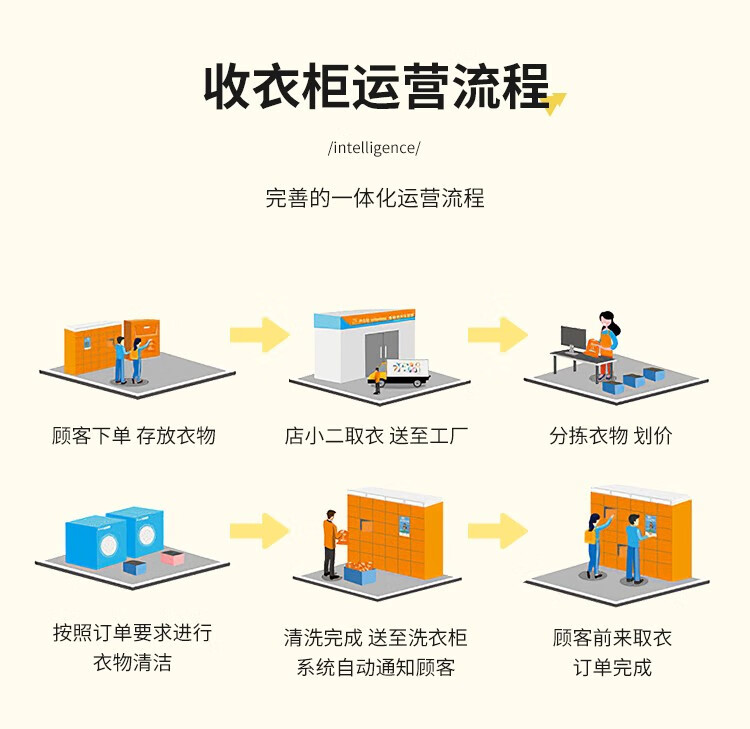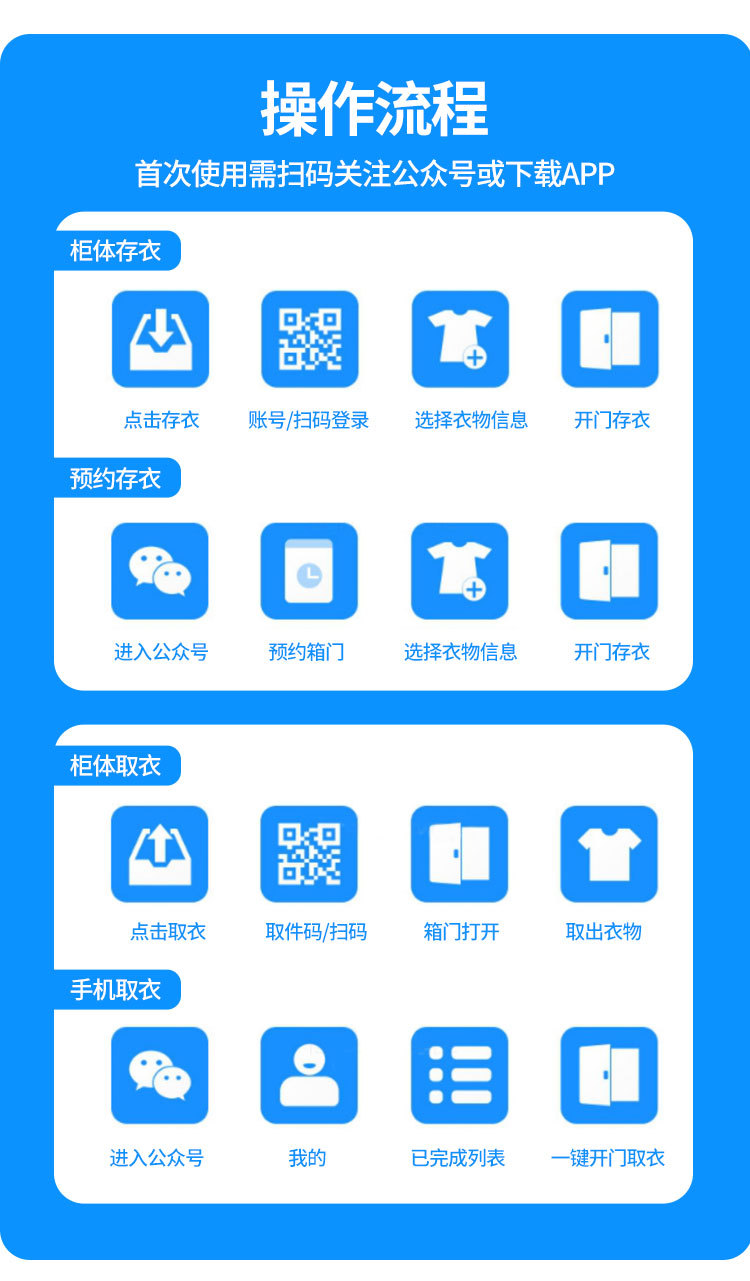 智能洗衣柜主要投放于高校、小區、公寓、企事業單位、商超等位置,其系統是線上洗衣APP與線下自助收發洗衣柜的結合,線上APP主要用于預約、下單、支付等。線下洗衣柜帶有用于信息輸入的操作平臺,用于客戶自助存放和拿去衣物。