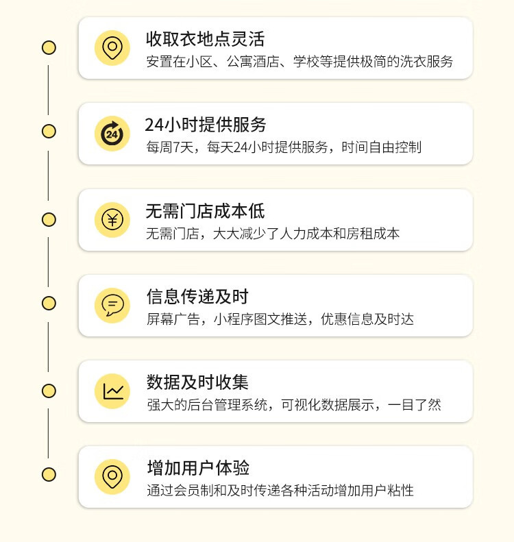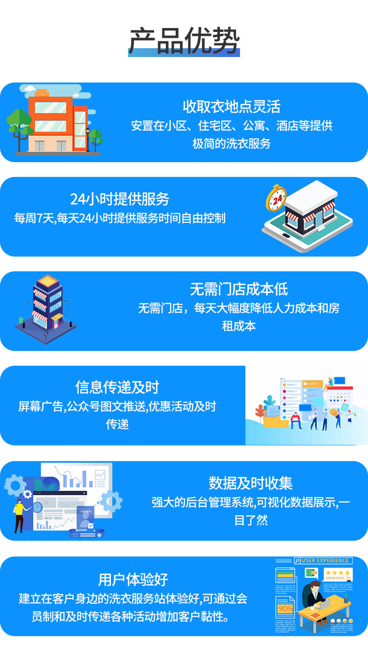 1. 24小時自助收發衣物,平臺或者商家收到系統訂單后自動分配給負責該商圈的店小二,訂單狀態實時跟蹤,用戶體驗好,清洗物的存取過程不用顯示密碼,僅適用隨機生成二維碼,保證安全性。